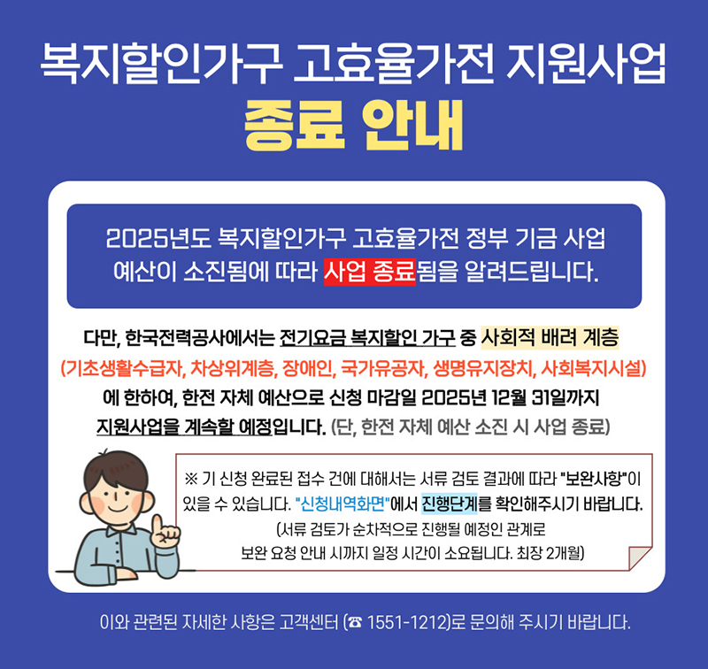 2025년도 복지할인가구 고효율가전 정부 기금 사업 예산이 소진됨에 따라 사업 종료됨을 알려드립니다.