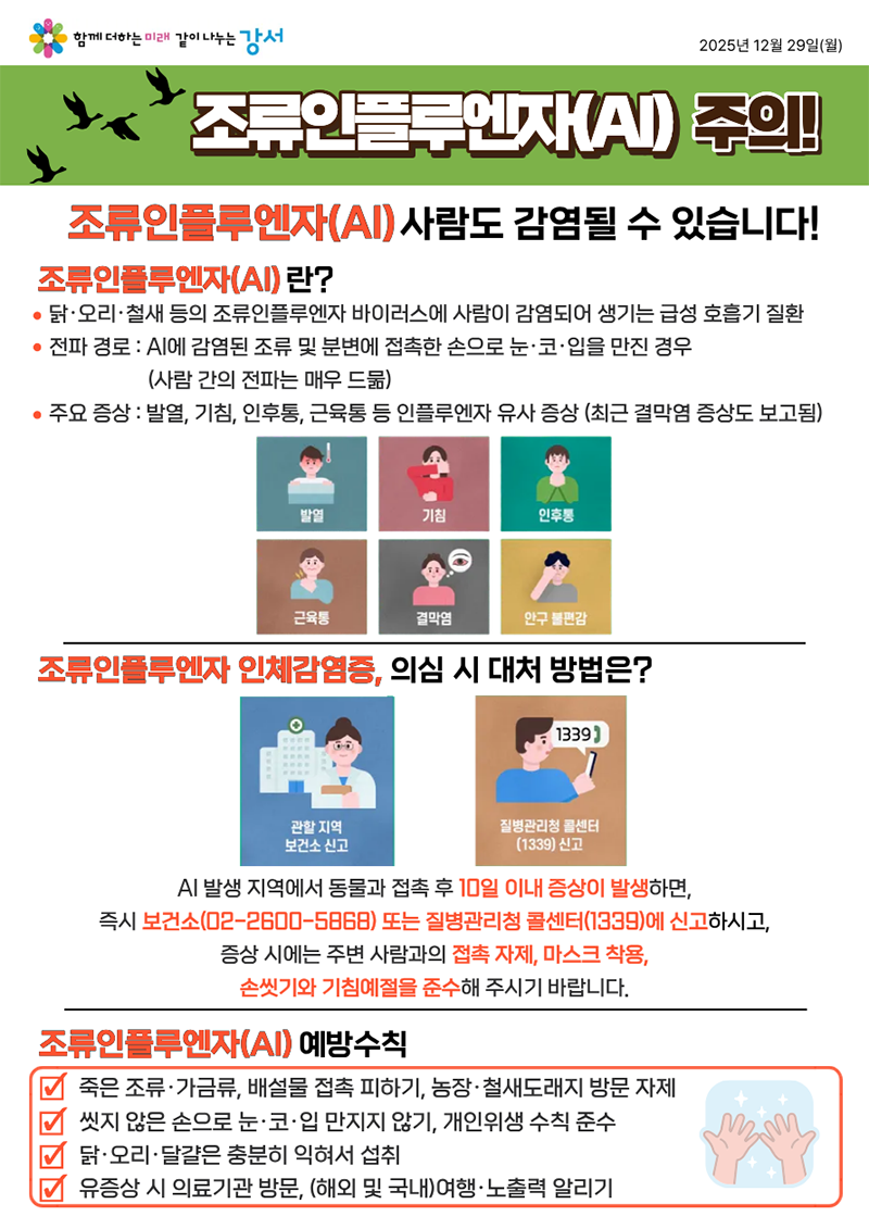 - 철새도래지·논·밭·하천변 등 방문 후에는 30초 이상 비누로 손 씻기 + 눈·코·입 만지지 않기