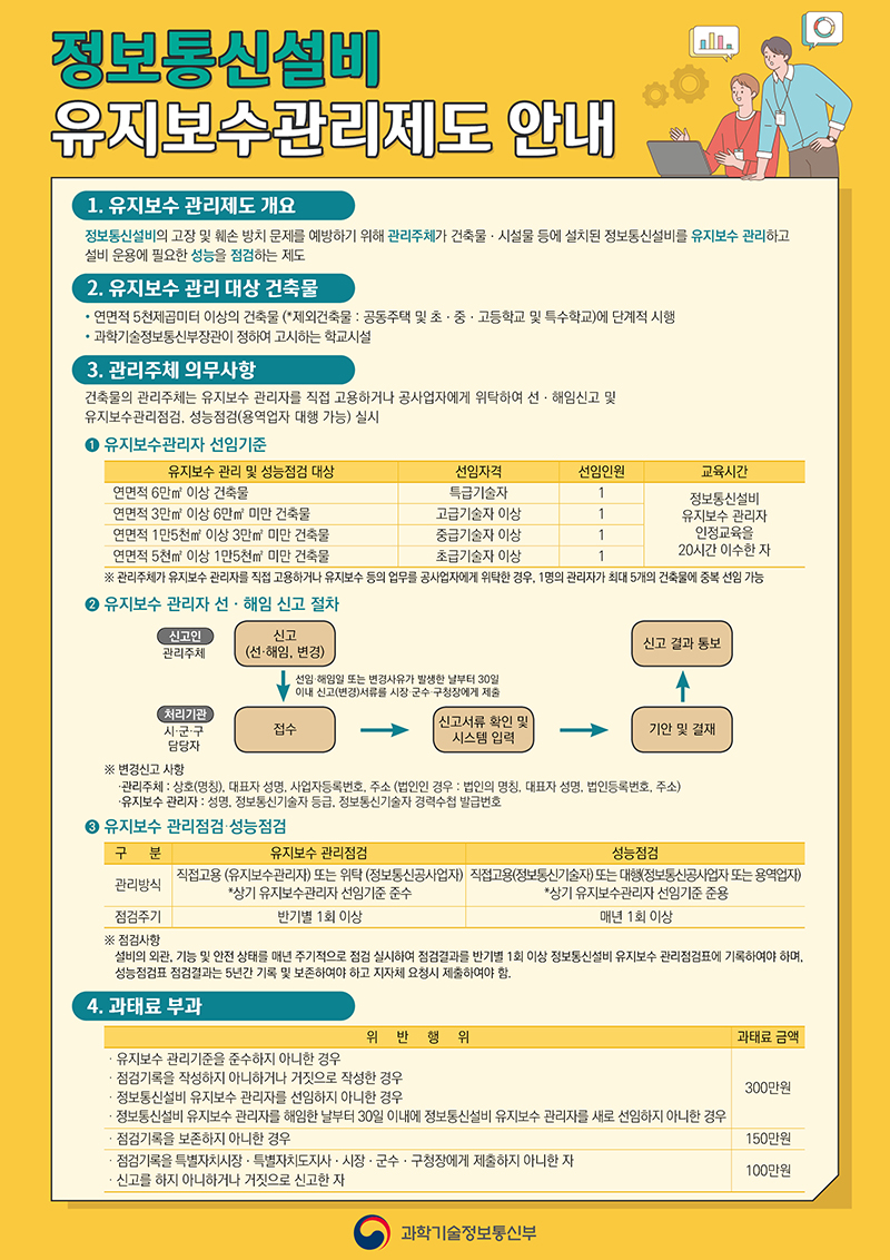 과학기술정보통신부에서는 건축물 내 정보통신설비의 안정성 확보와 사고 예방 등을 위해