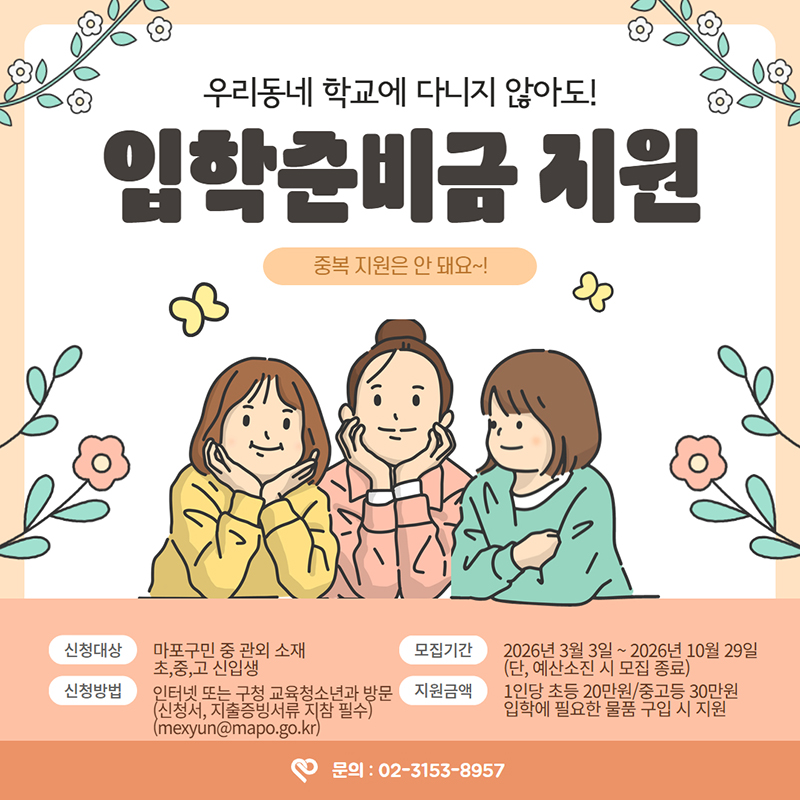 마포구는 2026년 서울시 외 타 시·도 소재 초·중·고등학교에 입학한 마포구 학생들에게 입학준비금을 지원하오니,