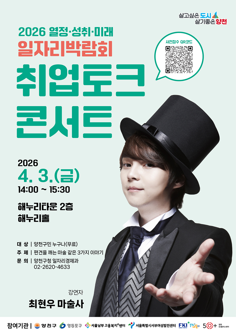 안녕하세요! 양천구 일자리플러스센터 입니다. 2026.양천구 일자리박람회 개최 및 취업토크콘서트 참여자를 모집합니다. ※ 참여신청서 제출시 개인정보 동의한 것으로 갈음 ※ 참여신청 안해도