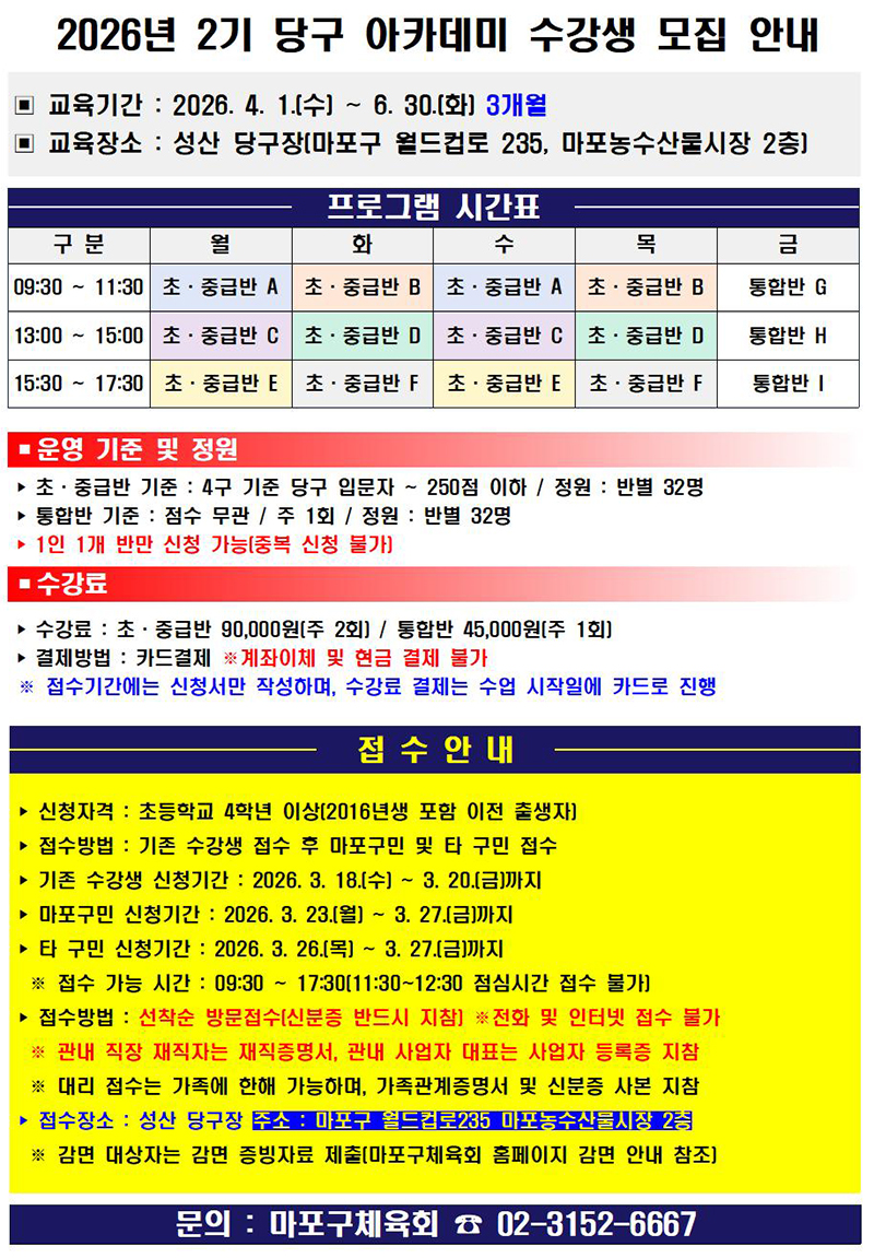 마포구 체육회에서 2026년 성산당구장 아카데미 2기를 아래와 같이 모집하오니 많은 참여 바랍니다.